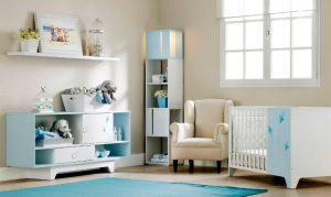 Esas tonalidades, presentes en la estantería que está en la pared y que incorpora debajo una sencilla mesa-escritorio, así como en las puertas y cajones del armario aportan un toque de distinción al dormitorio.